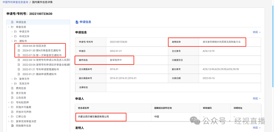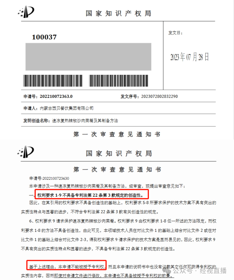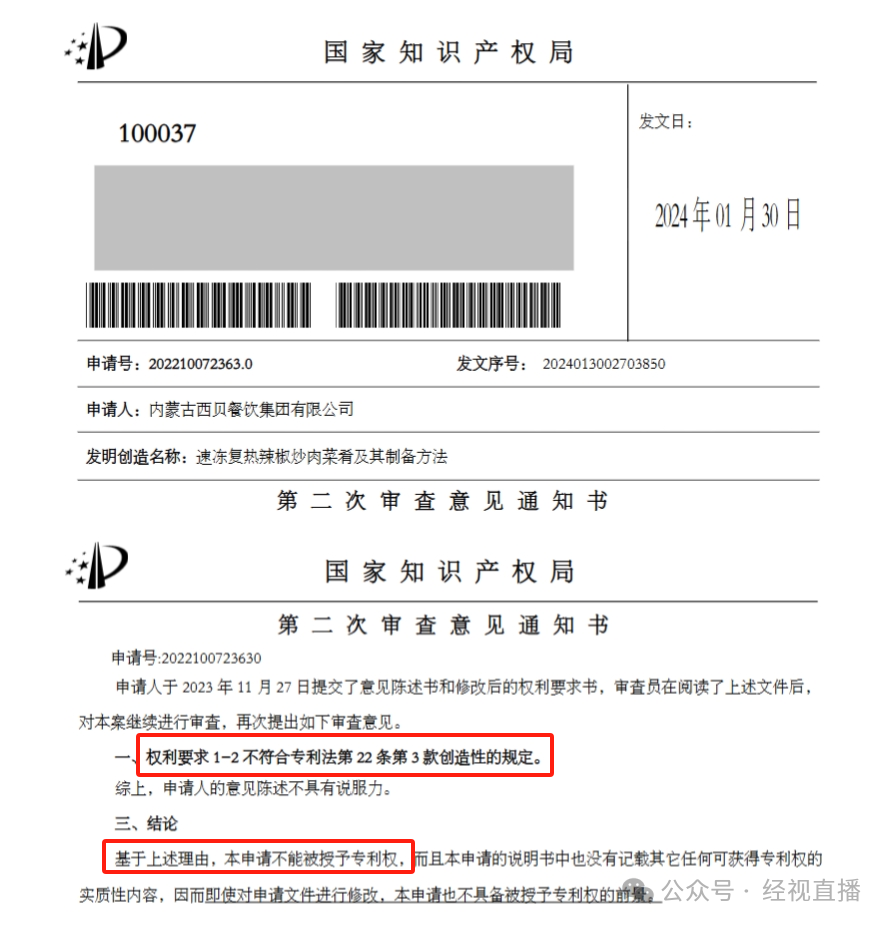 国家知识产权局对西贝这件专利在2023年7月和2024年1月,先后发出了两次审查意见通知书,均认为该专利申请的部分权利要求存在不具备创造性而不符合授予专利的缺陷。2024年7月,国家知识产权局发出了驳回决定。目前西贝提出了复审请求,该案件仍在审理中。
