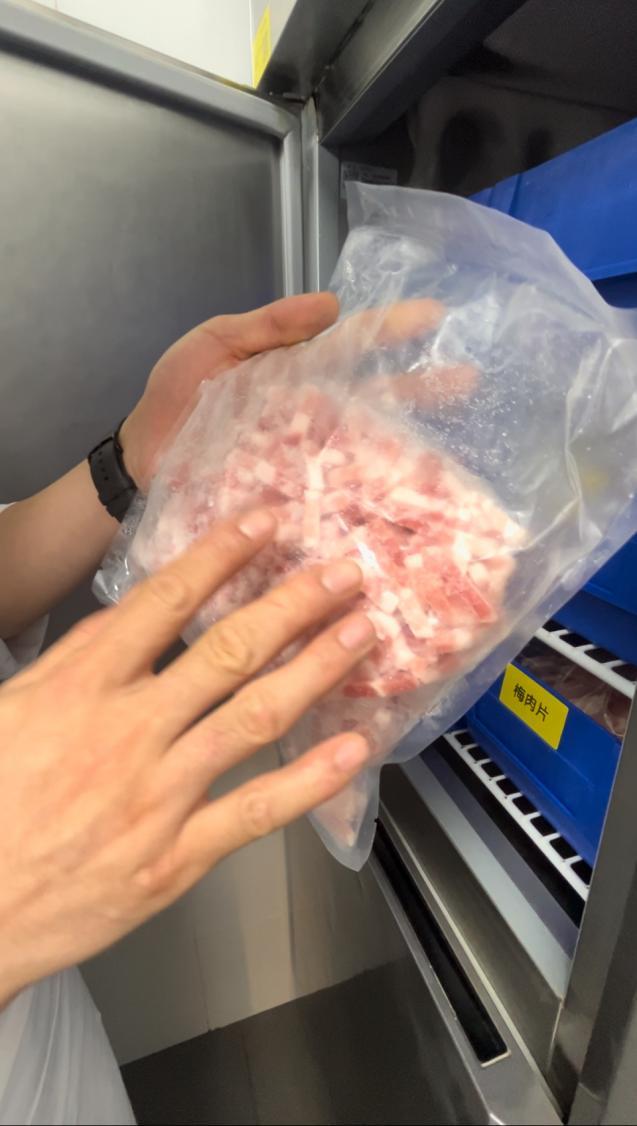 门店厨师长:如果这个做法不合格的话,它就不会流入市场的。你看这个牛肉,生产时间是2025年的8月21号,保质期虽然是两年时间,但它用不了那么长时间,今天就能用6袋-7袋肉,从中央厨房到店两三天就能消化完。