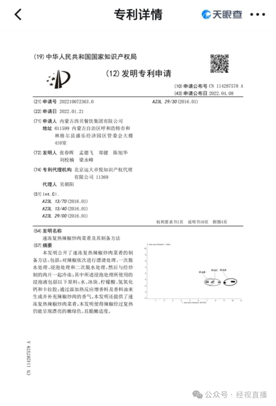 9月13日,经视直播记者在国家知识产权局查询发现,内蒙古西贝餐饮集团有限公司在2022年1月申请了一项名为“速冻复热辣椒炒肉菜肴及其制备方法”的发明专利,该发明专利摘要中注明:“本发明公开了速冻复热辣椒炒肉菜肴的制备方法,包括:对辣椒依次进行漂烫处理、一次脱水处理、浸泡处理和二次脱水处理,然后与经炒制的肉片一起冷冻;其中所述浸泡处理所使用的浸泡液包括以下原料:水、冰块、柠檬酸、氢氧化钙和卡拉胶;通过添加热反应增香料及香料油来生成并补充辣椒炒肉的香气。本发明还提供了速冻复热辣椒炒肉菜肴。本发明使得辣椒经过复热仍能呈现漂亮的嫩绿色,且脆嫩适度。”